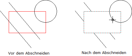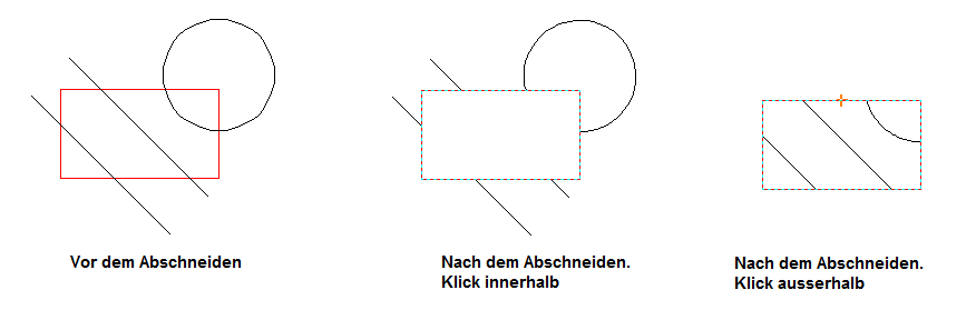 Zum Beispiel braucht man die Segmente von den Objekten Linie und Kreis, die innerhalb eines roten Rechteckes sind, zu löschen: