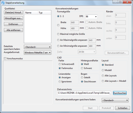 Stapelverarbeitung erlaubt dem Nutzer, ausgewählte Datei(en) in die *.bmp, *.emf, *.wmf, *.jpg, *.gif, *.tiff, *.pdf, *.plt, *.svg, *.cgm und *.dxf - Formate zu konvertieren. Wählen Sie den Menübefehl [Datei > Stapelverarbeitung]