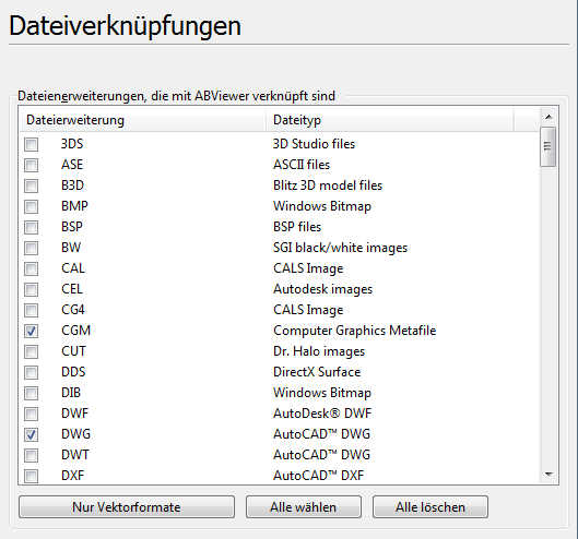 •Nur Vektorformate. Diese Option verknüpft nur CAD Dateien der unterstützten Formate mit CADEditorX-Benutzeroberfläche.