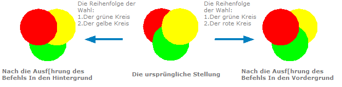 Die Anzeigenordnung der gewählten Objekte nach die Aktivierung dieser Befehle hängt von die Reihenfolge Ihrer Auswahl. Das Objekt, das erst gewählt wurde wird im Hintergrund bezüglich anderer gewählten Elemente nach der Veränderung der Anzeigenordnung sein. Zum Beispiel,