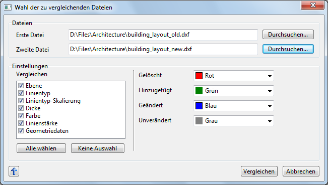 Wenn die Optionen gewählt sind, drücken Sie die Taste Vergleichen. Als Ergebnis werden veränderte, gelöschte oder hinzugefügte Objekte mit der Kontrastfarbe gezeigt. Die Anfangsdateien werden nicht verändert.