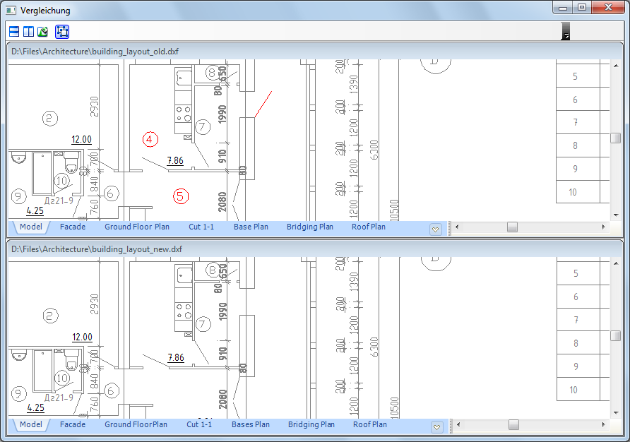 Als Voreinstellung werden die vergleichenden Zeichnungen nebeneinander vertical gezeigt. Mit Hilfe der Taste Horizontal kacheln im Fenster Vergleichung kann man ihre Lage verändern. Es gibt die synchrone Veränderung des Maßstabs für bequemere Durchsicht der Veränderungen. Mehr über diesen Befehl in der Sektion Dateien vergleichen.