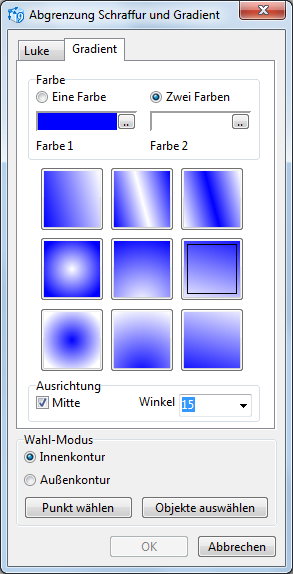 Button in der Werkzeugsleiste oder wählen Sie bitte Zeichnung -> Schraffur. Sie sehen das Abgrenzung Schraffur und Gradient Fenster. In dem Gradient Tab wählen Sie die nötigen Parameter.