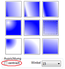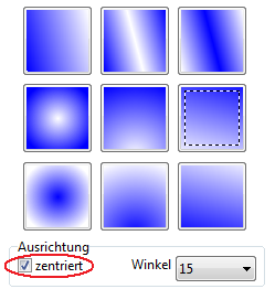 ozentriert - formt einen Symmetrischen Verlauf von Farben. Wenn diese Option nicht aktiv ist, sehen die Gradienten so aus, als ob Sie ein Lichtquelle abbilden.