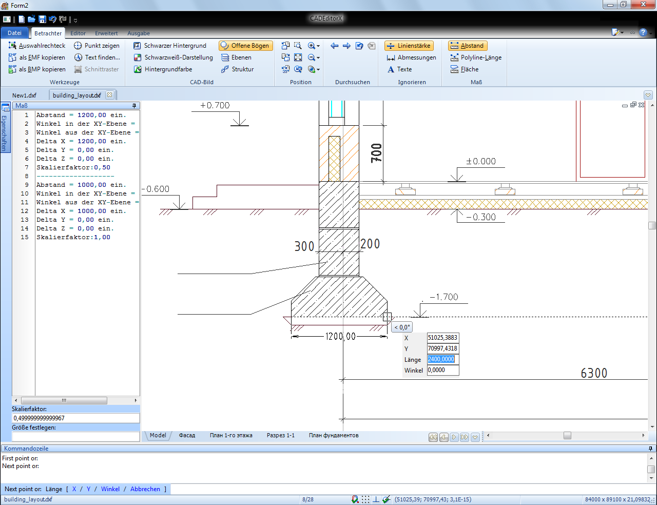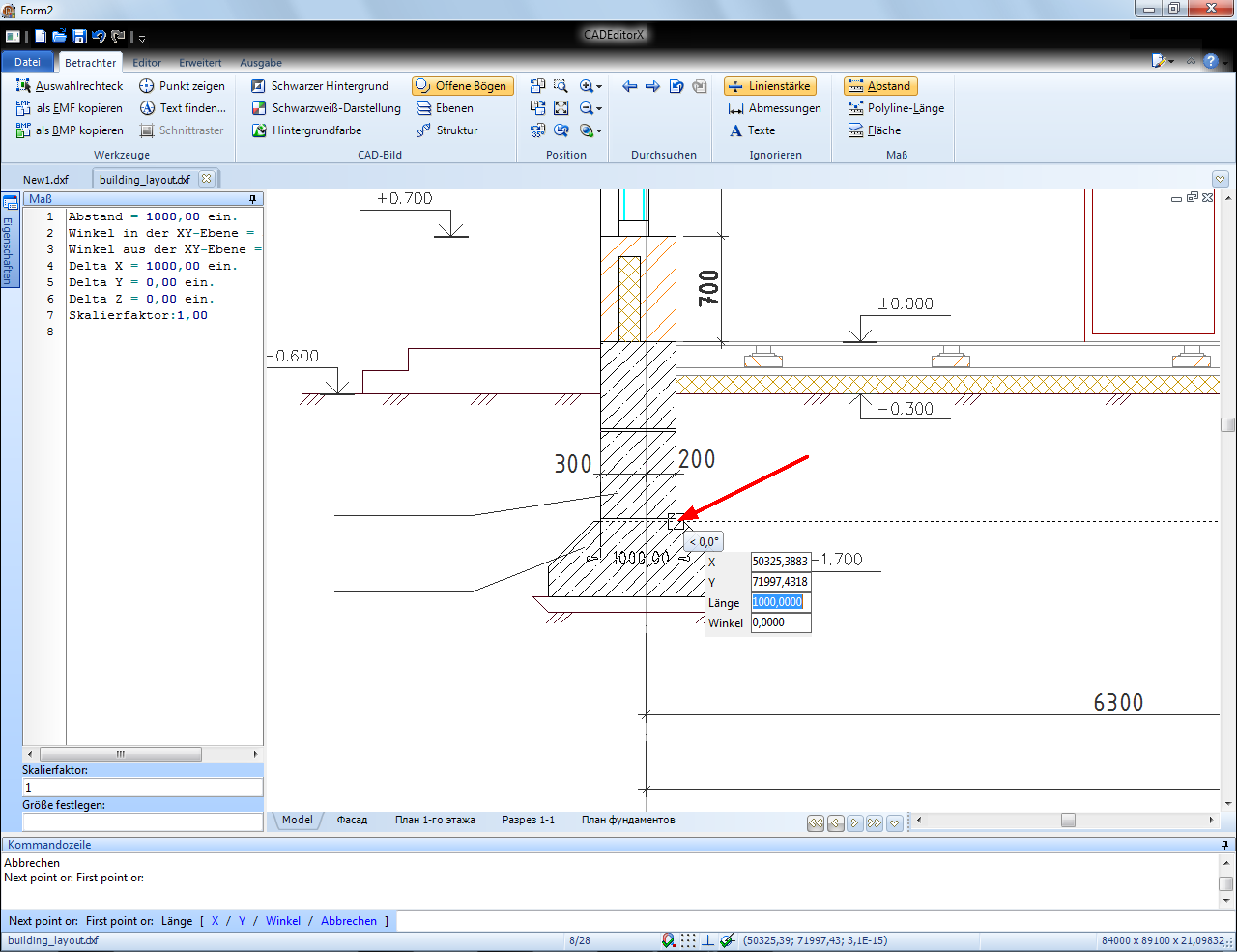 CADEditorX-Benutzeroberfläche erlaubt den Abstand zwischen zwei Punkten, die Fläche und das Perimeter zu messen. Es gibt die Möglichkeit, den Skalierfaktor für die Abmessungen schnell und anschaulich einzustellen. Die Ergebnisse der Abmessungen werden im Panel Maß angezeigt und in der Geschichte der Kommandozeile abgeschrieben. Mehr über die Abmessung-Werkzeuge: Maß-Werkzeuge.