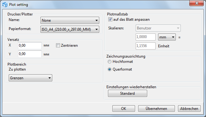Bei dem Erschaffen der neuen Zeichnungen werden der Drucker None und Papierformar А4 standardmäßig erstellt. Bei dem erstellten Drucker None wird der Druck nicht durchgeführt. Um die erstellten Druckparameter zu aktivieren, braucht man im Dialogfenster "Plot setting" den Button [Übernehmen] zu drücken.