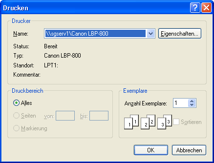Hinweis: Die Darstellung der Dialogbox "Drucken" ist von Ihrer Windows™ - Version abhängig.