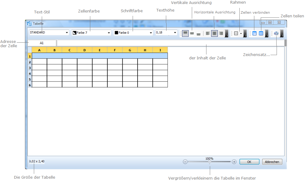 Man kann für jede Zelle die Parameter des Textes separat zu bestimmen. Die Einstellungen werden auf den ganzen Text der Zelle verwendet. Als Voreinstellung werden die Standardparameter der Bearbeitung für alle Zellen benutzt: Text-Stil - STANDARD, Texthöhe - 0,18, Schriftfarbe - 0, horizontale Ausrichtung - zentriert, vertikale Ausrichtung - oben bündig.