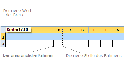 Man kann die Grüße der Spalten und Zeilen mit Hilfe der Maus oder bei der Eingebung des präzisen Wertes der Größe in ein entsprechendes Feld ändern. Richten Sie den Cursor auf die Grenze der Zellen im Gebiet der Namen. Nachdem der Cursor verändert, halten Sie die linke Maustaste fest und machen Sie die Änderungen. Dabei wird der aktuelle Wert gezeigt: