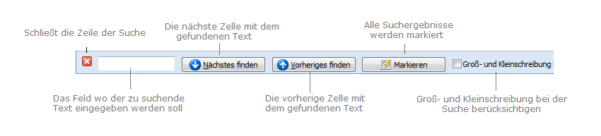 Um schnell zu die bearbeitete Zelle zu passen, kann man ihre Adresse ins Feld der Adresse der Zelle eingeben. Man kann auch die Suche nach dem Inhalt der Tabelle benutzen. Um die Zeile der Such aufzurufen, klicken Sie recht innerhalb der Tabelle und wählen Sie Suchen oder verwenden Sie die Tastenkombination Strg+F. Unten erscheint die Suchenzeile: