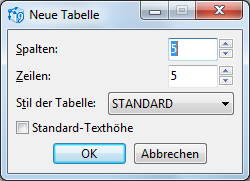 . Nach der Festlegung eines rechteckigen Bereichs, wo die Tabelle eingezeichnet wird, erscheint das Dialogfenster "Neue Tabelle". Geben Sie bitte die Parameter ein: