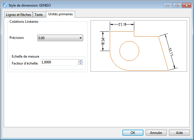 Le paramètre Précision définit le nombre de chiffres décimales dans le texte de cote.