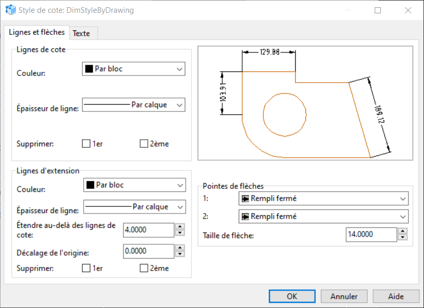 L'onglet Lignes et flèches contient quatre groupes : Lignes de cote, Lignes d'extension, Pointes de flèche et Taille des marques / lignes d'axe.
