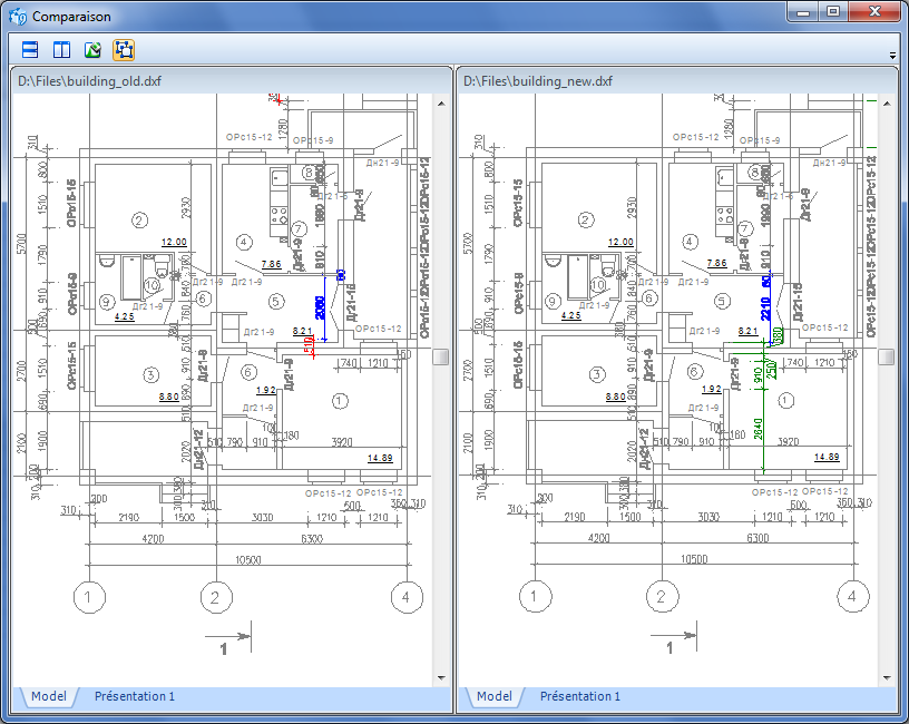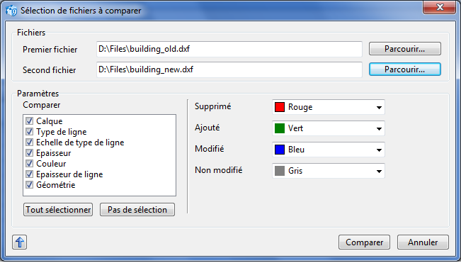 Après que tous les réglages nécessaires sont sélectionnés, veuillez cliquer sur Comparer. Par conséquent, toutes les entités modifiées, supprimées et ajoutées seront affichées en couleur contrastée. Aucunes modifications sont appliquées aux fichiers initiaux.