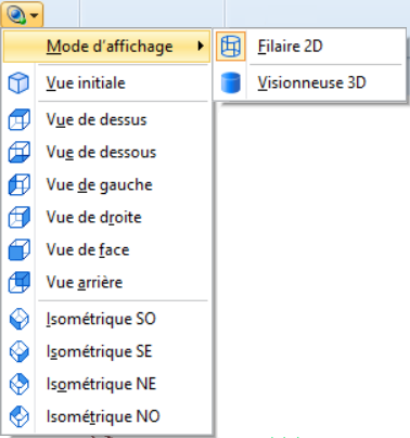 Dans CADEditorX User Interface le mode d'affichage de modèle 2D est disponible en cliquant sur la flèche noire dirigée vers le bas de la commande Orbite 3D.