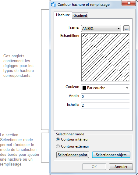 Une zone du dessin peut avoir une hachure ou un remplissage. Les remplissages peuvent être solides et gradients. Pour les ajouter on utilise la commande Hachure dans CADEditorX User Interface qui appelle la boîte de dialogue Contour hachure et remplissage.