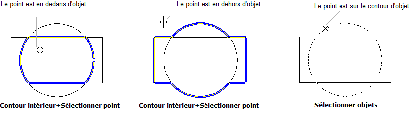 Pour sélectionner des objets les boutons [Sélectionner point] ou [Sélectionner objets] de la boîte de dialogue Contour hachure et remplissage sont utilisés. Les options Contour intérieur et Contour extérieur sont utilisées en combinaison avec la commande Sélectionner point et définissent où le clic de la souris se ra effectué - en dedans ou en dehors d'objet. Par optant pour Sélectionner objets on passe au mode de la sélection d'objets dans le dessin. Pour finir la sélection d'objets et revenir à la boîte de dialogue Contour hachure et remplissage appuyez la touche Entrée.