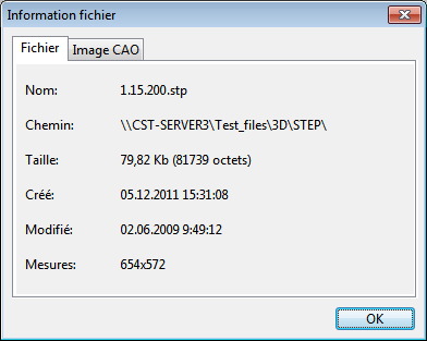 Pour des fichiers de CAO le deuxième onglet Image CAO est disponible. Il contient l'information plus détaillée sur le fichier : la version, la page de code, la calque active, les styles de texte et de cote actifs, le type de ligne active, la quantité de tableaux, de blocs et d'entités.