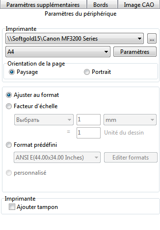 •Format prédéfini. Cette option définit la dimension du dessin à imprimer. On peut sélectionner un des formats standards dans la liste déroulante. Il est possible d'ajouter un format personnalisé à l'aide de la boîte de dialogue Formats qui est appelé par un clic sur le bouton Editer formats à droite de la liste déroulante. La boîte de dialogue Formats affiche une liste de formats standards qui ne peuvent pas être supprimés ou modifiés. La boîte de dialogue contient trois boutons pour gérer les formats personnalisés :