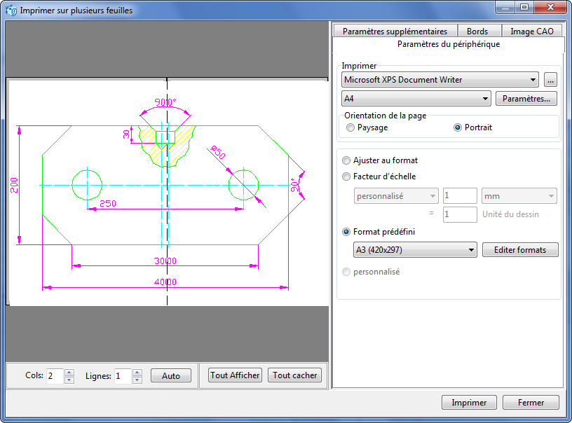 Par exemple, on a un dessin A3 qu’on voudrait imprimer sur une imprimante A4. Il faut sélectionner la zone nécessaire à l’aide d’outil Fragment. Ensuite on doit cliquer sur le bouton Impression sur plusieurs feuilles (onglet Sortie). Une boîte de dialogue offrira de sélectionner des réglages nécessaires. Car le dessin à imprimer doit être du format A3, on doit sélectionner l’option Format prédéfini et la valeur A3 dans la liste déroulante de formats standards. Il faut cliquer sur le bouton Auto en bas de la fenêtre sous l’aire de prévisualisation et le dessin sera divisé en deux feuilles A4. Pour exclure une feuille de l’impression, on doit cliquer sur la feuille dans la zone de prévisualisation avec le bouton gauche de la souris.