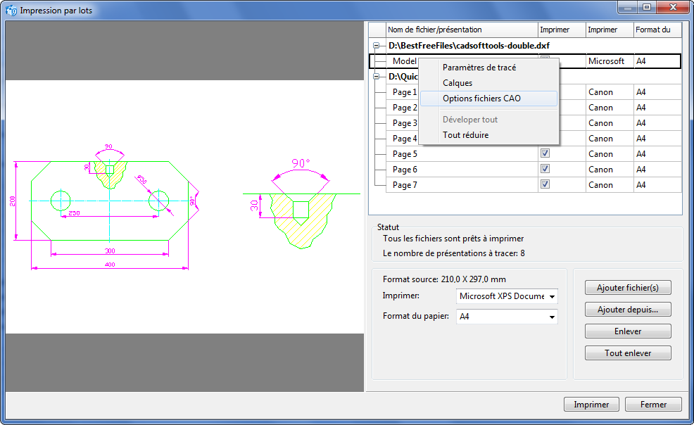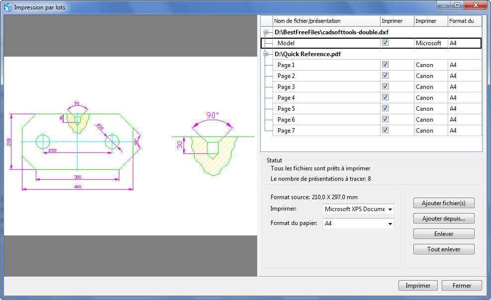 Le travail avec les documents de conception nécessite souvent impression de plusieurs fichiers sur imprimantes différentes sur le format de papier différent. Vous n’aurez plus à prendre votre temps à ouvrir chaque fichier et spécifier les réglages nécessaires surtout si les fichiers sont volumineux.