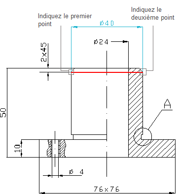 2. Mesurez une partie de la vue principale de la pièce à l'aide du mode Accrochage [F9]. Par exemple, mesurez la partie supérieure de la pièce dont le diamètre est 40 unités. La ligne mesurée est marquée avec la couleur rouge dans le dessin suivant. Les résultats seront affichés dans la palette Mesurer.