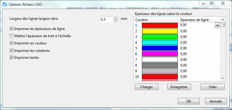 Dans la section Epaisseur des lignes selon la couleur il y a une liste de numéros de couleurs avec la possibilité de spécifier l'épaisseur pour chaque couleur. On peut enregistrer et charger les paramètres pour cette section depuis un fichier avec l'extension *.cws. Il faut pour cela utiliser les boutons [Charger] et [Enregistrer], ils sont sous la liste de couleurs. Le bouton [Effacer] annule les paramètres de cette section.