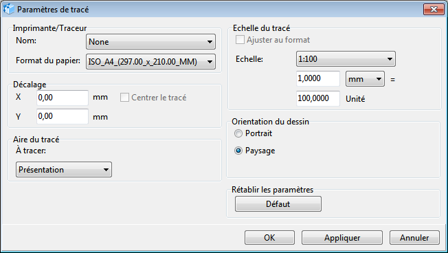 Lorsque nouveaux plans sont créés ; l’imprimante None et le format А4 sont utilisés par défaut. Si l’imprimante None est spécifiée, le plan ne sera pas imprimé. Pour appliquer les paramètres spécifiés, veuillez cliquer sur Appliquer dans la boîte de dialogue Paramètres de tracé.