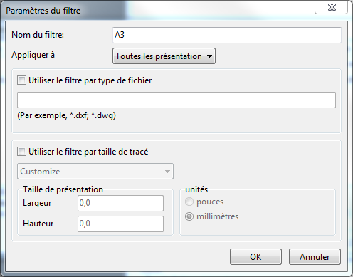 Utiliser le filtre par taille de tracé. Sélectionne des présentations par taille de tracé qui est spécifiée dans les paramètres de présentation du fichier source. Saisissant la taille de papier pour la recherche, il faut prendre en compte l'orientation du dessin.