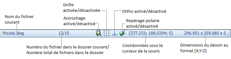 La barre d'état est une barre horizontale en bas de la fenêtre du logiciel qui ne peut pas être cachée ou déplacée. Elle contient l'information suivante :
