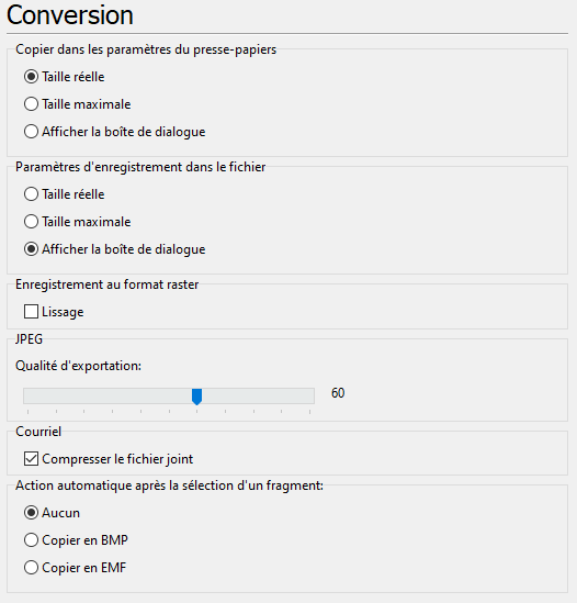 Cet onglet contient des paramètres qui définissent l'action exécutée à l'enregistrement du dessin courant dans le fichier et au copiage de l'image dans le presse papier. Ces paramètres n'influent que enregistrement et conversion aux formats rasters et métafichiers.