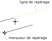 Usage : indiquez le point de départ sur le dessin. Avec le mode de Repérage activé, placez le marqueur de repérage sur l'objet qui doit être parallèle au vecteur de direction d'élément. Après cela quand le curseur de la souris est placé parallèlement à un segment linéaire, une ligne de repérage apparaît.