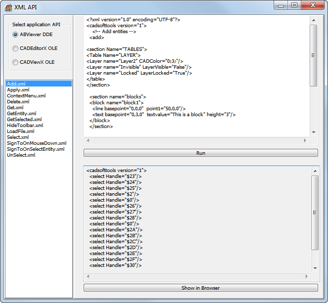 Dans CADEditorX User Interface, vous pouvez accéder le structure d’un plan à l’aide d’interface XML. Le packet contient une application qui communique avec CADEditorX User Interface à l’aide de technologie DDE. La commande Run DDE Demo lance le fichier XML.exe, qui est stocké dans le dossier où se trouve le logiciel installé.